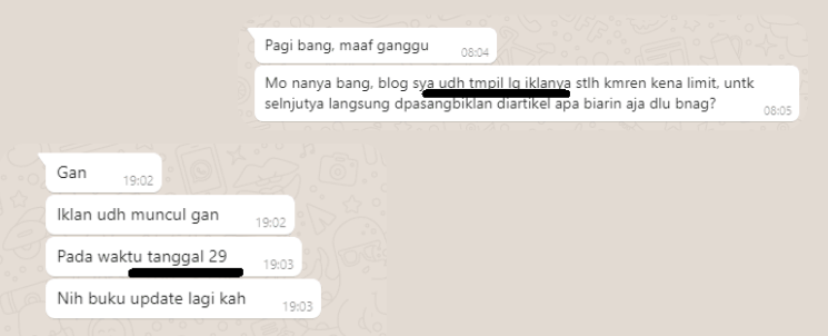 Tidak banyak orang sabar dengan waktu yang lama, termasuk saya. Dan saya yakin Anda juga. Membiarkan iklan tidak tayang dalam waktu lama akan sangat merugikan, dan iklan yang tidak ditayangkan dalam waktu tertentu berpotensi mendatangkan peringatan baru atau dianggap menjadi situs yang tidak aktif.
